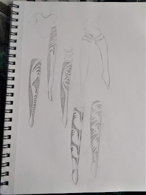 This was really the fun part for me. First of all, I made a bunch of drawings laying out what I wanted the lekku and montrals to look like. Traditionally, Togruta have some variety of striped markings, but it's a wide variety, so have fun. I chose mostly chevrons and some Pacific Northwest Indigenous-inspired markings. In addition, you have to decide how clean you want your markings. I went with the sharper edges of the animated Star Wars series, as opposed to the blurrier live action markings.